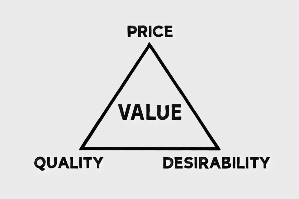 Customers buy based on value. So that is effectively whether or not they consider the item that you’re selling to represent good value. If they believe it represents good value, they will buy it. And if they don’t think it’s good value, they won’t buy it. This is what I call the value triangle. The value is made up of three things. The price of a product, the quality of the product and the desirability. So to dive into that in a little bit more detail, all three of those have to be aligned for something to sell.